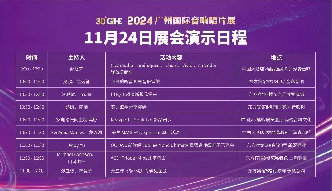 2️⃣ 本届展览将有一批国际音响名牌的创立者、管理高层、技术总监和著名音响设计师从世界各地到场参展,在展览现场隆重举行各种产品首发式、技术讲座、顶级音响专题欣赏会、著名音响设计师见面会等一百多个现场活动。同时,一众发烧歌手、著名录音师也将进行现场见面和签售活动,音响与音乐文化共冶一炉。展会部分演示日程先睹为快!
