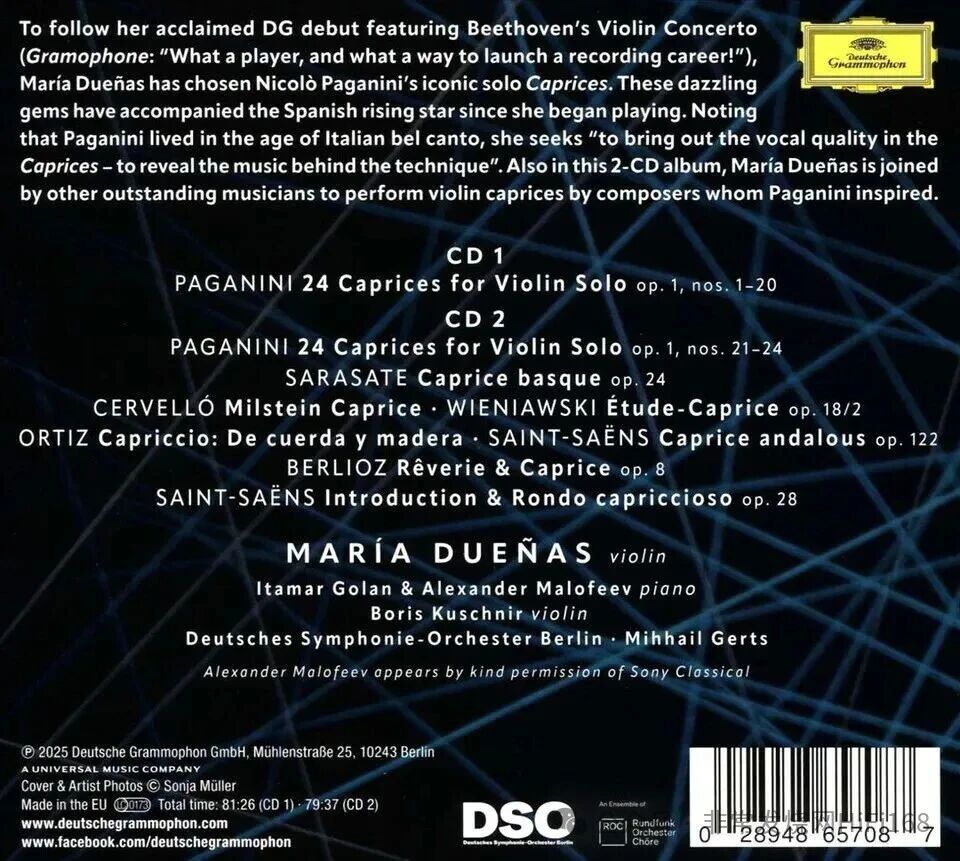 这张专辑不仅展示了玛丽亚·杜埃尼亚斯出色的小提琴演奏技艺,更以别具匠心的编排,展现了帕格尼尼作品的多元魅力。她将随想曲的技术挑战与音乐表现力结合,演绎出从激情澎湃到柔情似水的多种情感层次。