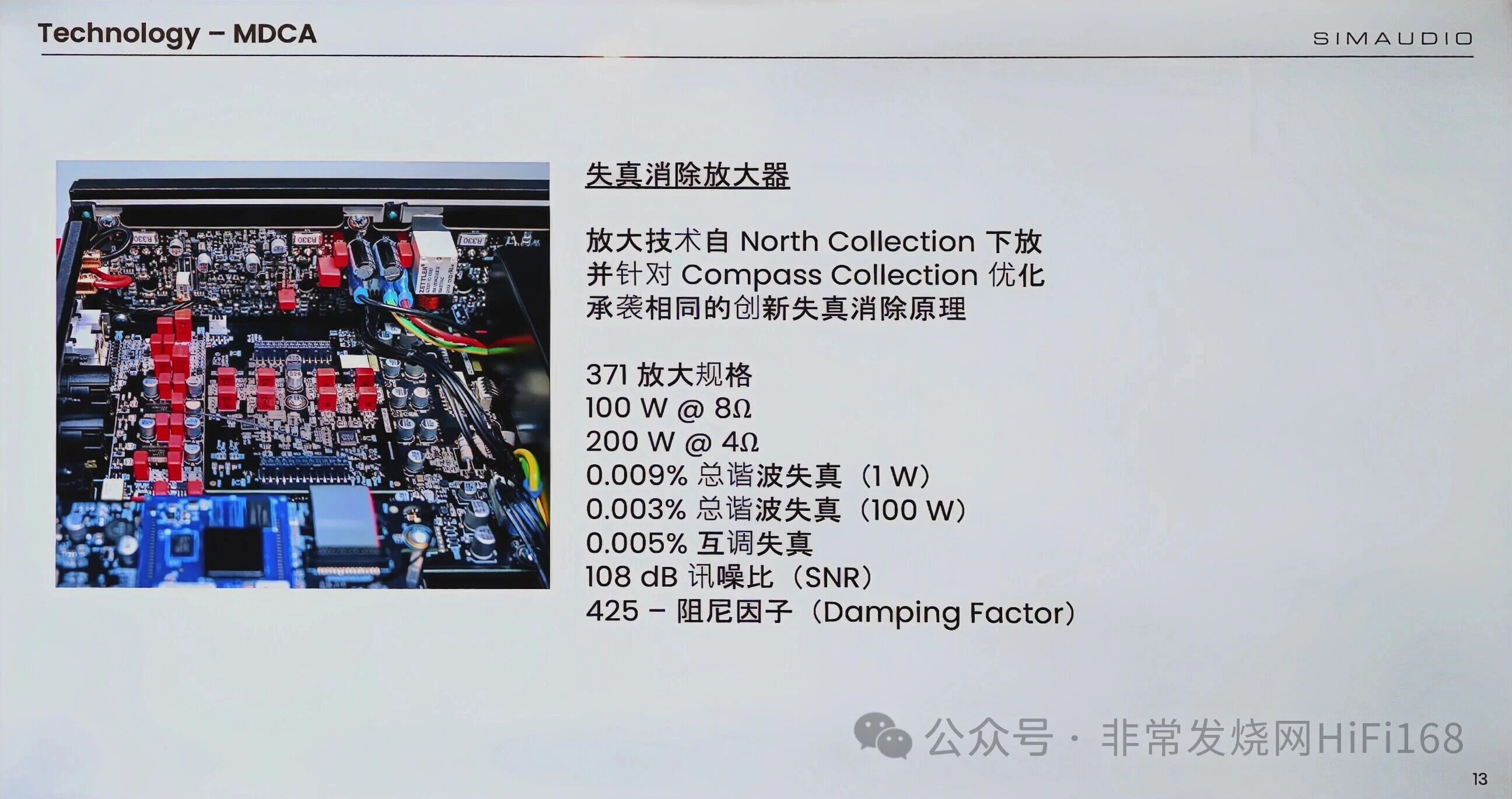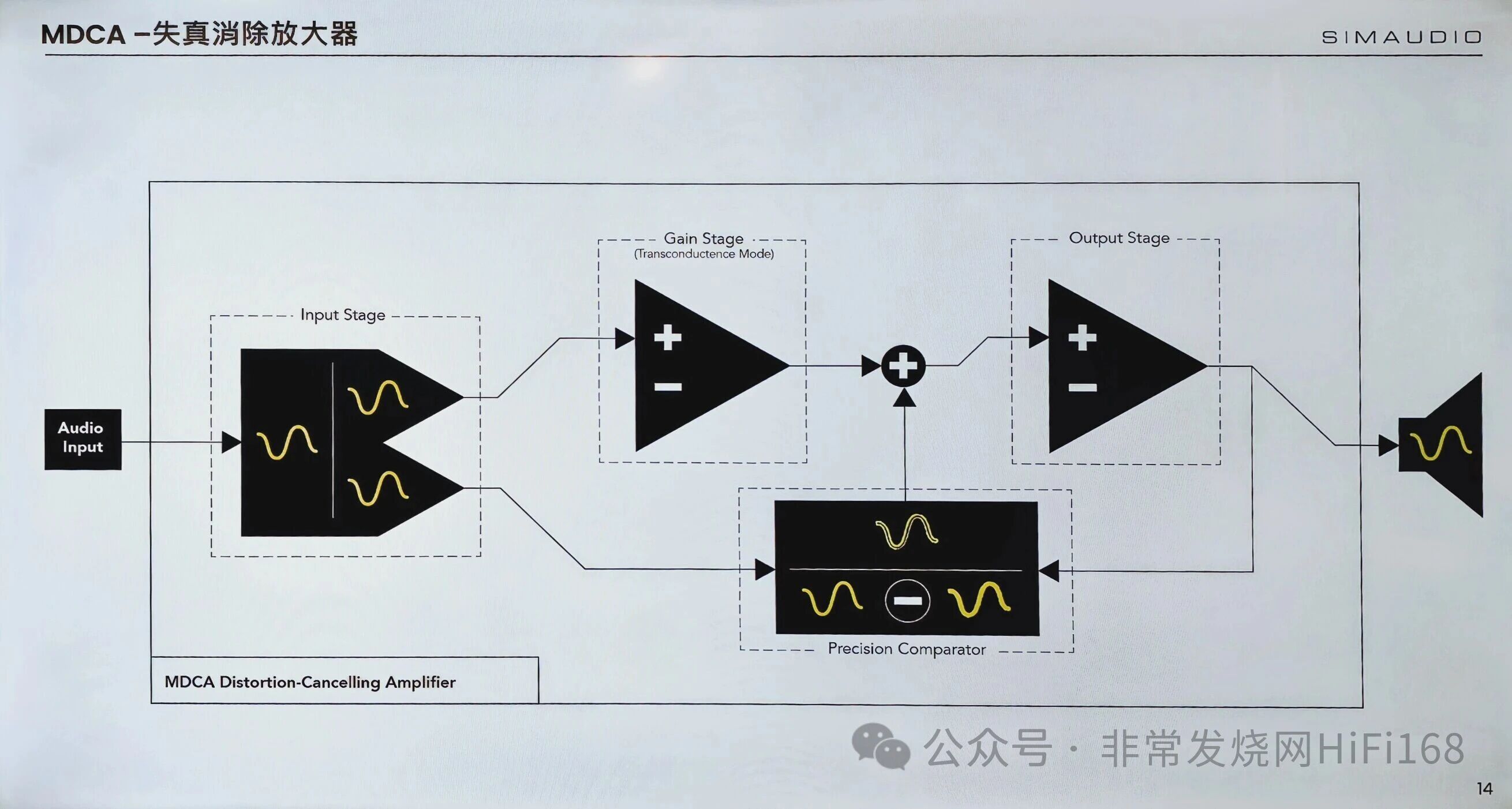 MDCA放大技术源自North Collection,输出功率为100W(8欧姆)和200W(4欧姆),具有高信噪比和良好的阻尼系数(约1825),有效提升声音控制力与细节表现。其工作原理是通过精密比较器实时检测输入与输出信号差异,注入反向失真信号以抵消正向失真,从而获得快速、干净且细腻的声音。