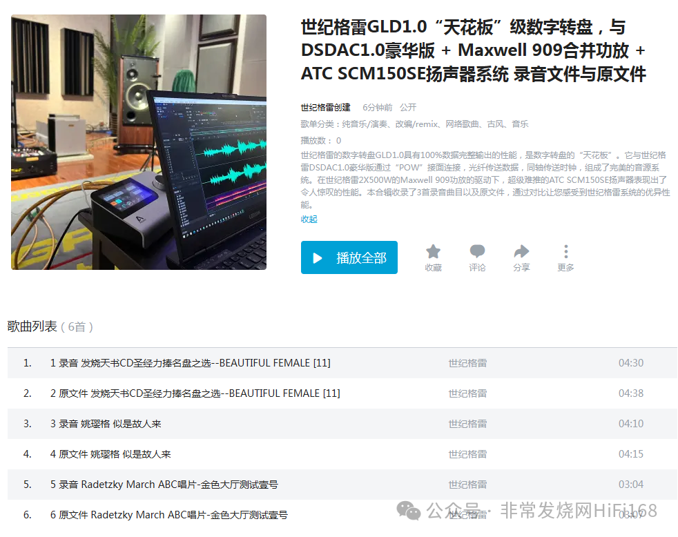 录音,同曲源文件均给出。您可以在手机上聆听,也可以手机播放通过蓝牙推送到大系统、车载系统中曲对比。 录音与源文件是肯定有差异的,关键是看差异在哪里。 GLD1.0系统的录音,声音工整饱满,几乎没有缺陷,信息量与高频表现与源文件基本一致,韵味乐感保持完整,差异仅在混响程度和风格上,这是听音室录音与录音棚录音的差异,不是素质上的差异。