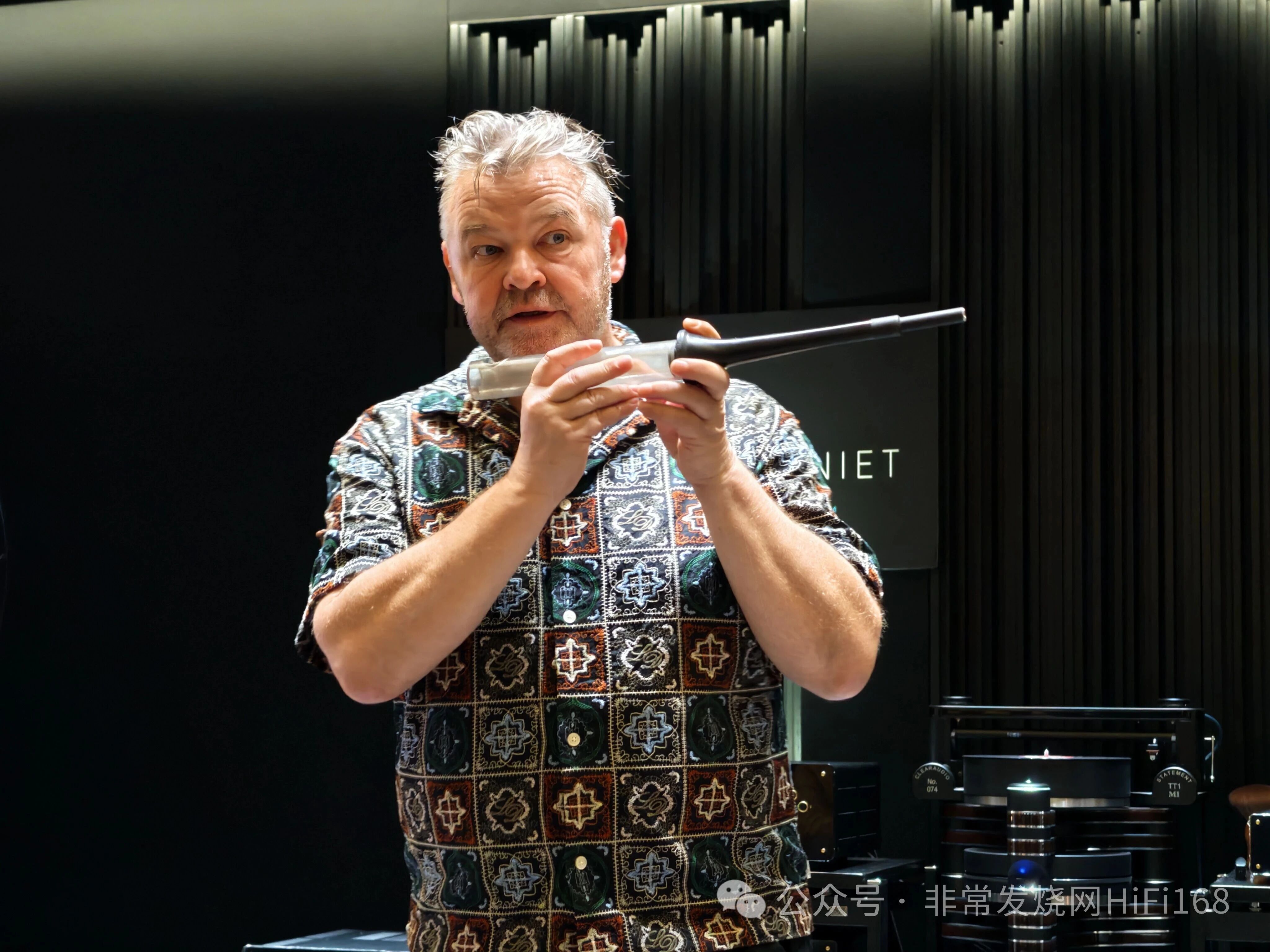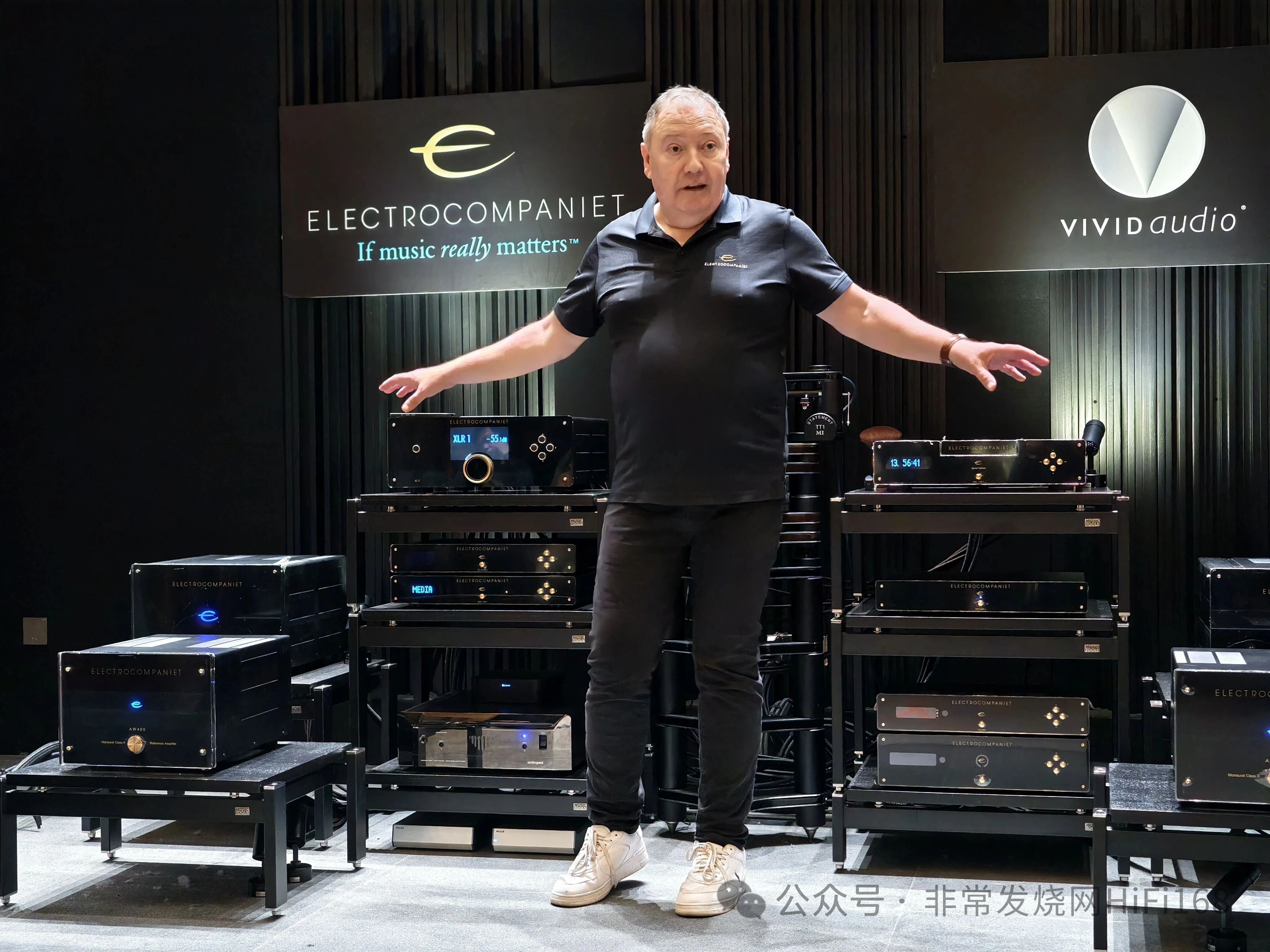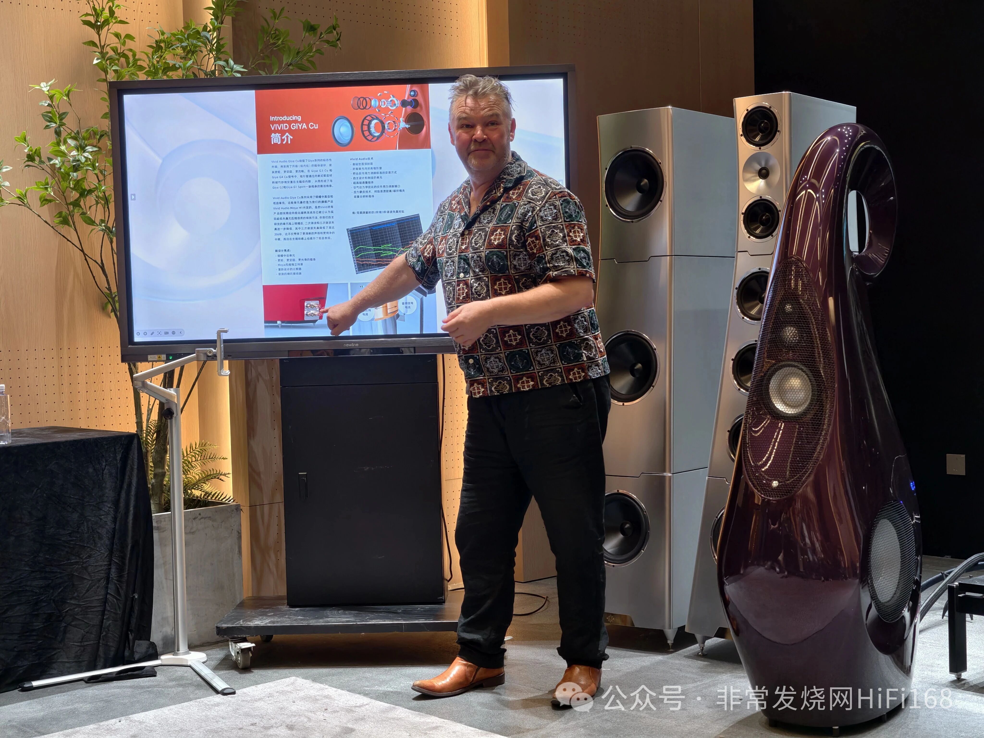 紧接着,Vivid Audio的国际销售经理Ewald Verkerk先生也亲临发布会现场。他上台分享了Vivid最新推出的Cu系列新品所蕴含的核心技术与前沿创新。Vivid Audio新推出的Giya Cu,依旧秉承了品牌轻量化、低储能以及高刚性的设计理念。其技术亮点在于采用了全新优化过的复合材料单元结构,并改良了声学腔体,使得振膜的运动更加线性,失真率显著降低。此外,全系列音箱继续沿用了Vivid标志性的反谐振管(Tapered Tube)吸能技术,这一设计有效抑制了单元背波的共振现象。同时,通过重新设计的内部力学支撑结构和箱体曲线,音箱在保持其纤薄外观的同时,也获得了更高的结构稳定性。新一代的专利驱动单元与升级后的分频网络相互配合,使得Cu系列在动态表现、解析力、瞬态响应以及音场一致性方面均有了进一步提升,为用户带来了更加精准、通透且富有速度感的声音体验。