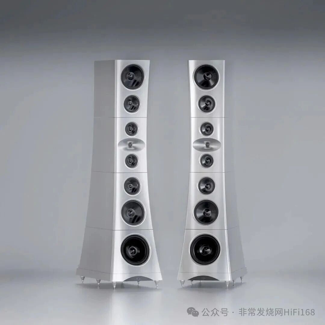 这一款密闭式落地音箱,其庞大的箱体尺寸为宽 540 mm、高 2150 mm、深 1080 mm,内部容纳八个扬声器单元。它由五个模块组成,包括底座,并采用五层结构,由两层减震材料夹在三层特制铝合金之间。只有前面板采用 75 mm厚的航空级铝材,并经过特殊热处理