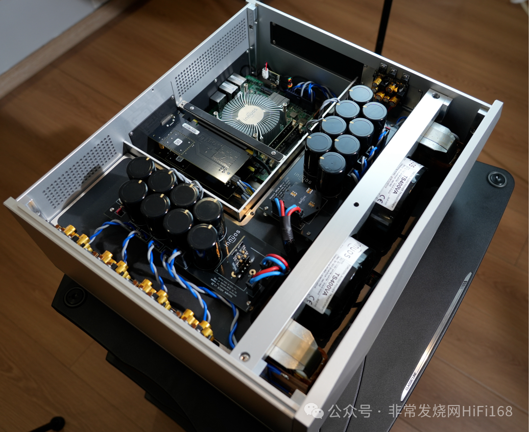 NAZARE的机箱设计可以说前所未有,无论是48*43*22cm(w*d*h)的霸气外形还是41kg的巨大重量都是数播领域巨无霸的存在。NAZARE的外壳使用1cm厚的铝合金CNC而成,内部也将变压器部分、电源部分、氮化镓部分、主板部分、网络和音频输出模块部分进行单独隔离,以减少互相的干扰。在机箱内部的避震材料上,音若思与TONEO合作使用SmartStack科技的特殊材料为关键硬件和部位进行避震。同时在脚垫的部分与IsoAcoustics进行合作,使用悬浮避震脚垫。无论是隔离还是避震,音若思都做到了极致。