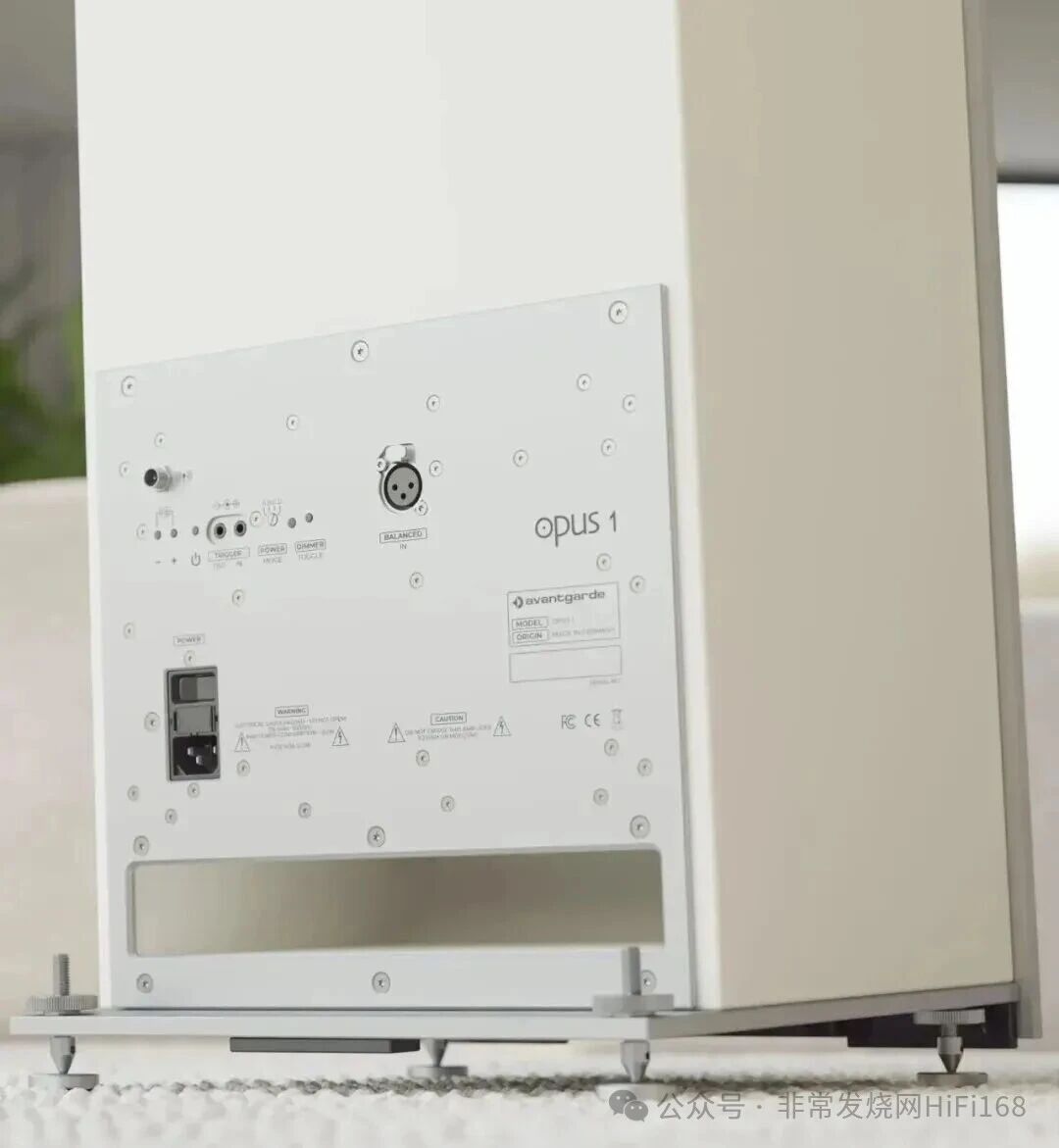OPUS1的箱体为铝木复合的结构,前障板和底部支撑使用铝合金材料,具有更好的刚性并且在质感上更为高级。箱体使用木质结构,长方形的导向孔位于后侧底部,专用的脚钉提供了2.7°的后倾空间以更好的匹配聆听位置。