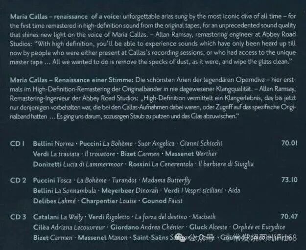 这一套三张专辑,就是从这些擦拭后的录音里,选出最能代表卡拉斯个人艺术的片段,以及女声经典咏叹调,包括她未曾在舞台上演出过的《杜兰朵》里的「柳儿」、《波西米亚人》的「咪咪」,以及《卡门》。