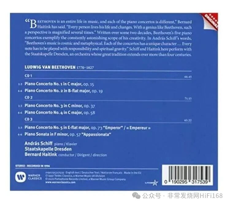 之所以推荐此版贝多芬《钢琴协奏曲全集》录音,是因为:席夫与海廷克的诠释实现了忠于原作与艺术再创作的统一;独奏乐器与管弦乐团的统一;以及技术与情感的统一。席夫的钢琴技巧精湛却不炫技,海廷克的指挥严谨却不机械,两者都让技术服务于情感表达,让听众既能感受到贝多芬的英雄性与哲思,又能沉浸于音乐的美感之中。