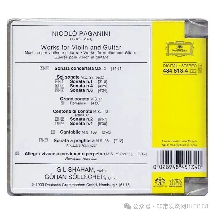 这份录音由小提琴家沙汉姆与吉他演奏家索谢尔共同演绎——帕格尼尼多首小提琴与吉他奏鸣曲,被《企鹅唱片指南》评鉴为3星带花名盘。