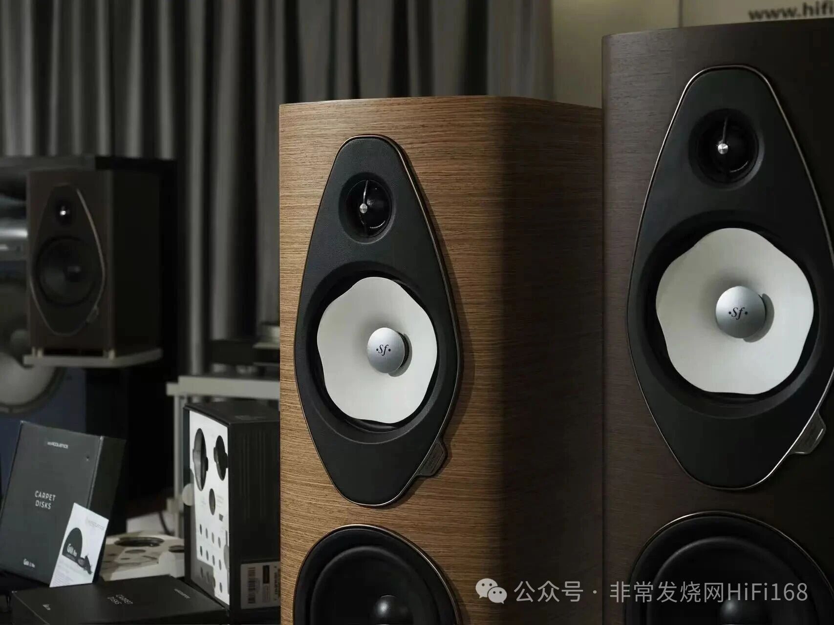 作为Sonetto 系列的中坚型号,这款意大利原产音箱的核心优势集中在声学设计与材质运用,从单元配置上来看,搭载从百万级 Suprema 旗舰下放的 16.5cm “山茶花”(Camelia)中音单元,纸浆锥盆采用花瓣状几何结构,配合铝制相位塞与独立软木腔体,大幅降低共振,实现顺滑自然的中频表现。辅以 28mm 丝膜高音(延伸至 49kHz)与双 16.5cm 低音单元,构成三频均衡的三分频架构,频响范围 38Hz-40kHz(-6dB)。标志性鲁特琴弧形箱体搭配胡桃木 / 鸡翅木 / 黑色饰面,混凝土底座兼顾稳定性与工业美学,但 4 欧姆阻抗(最低 2.78 欧姆 @96Hz)与 89dB 灵敏度,对功放推力提出一定要求,官方建议搭配控制力强劲的合并机或前后级系统,我们这次用和弦合并机也能很好地匹配,没有现象中难推。