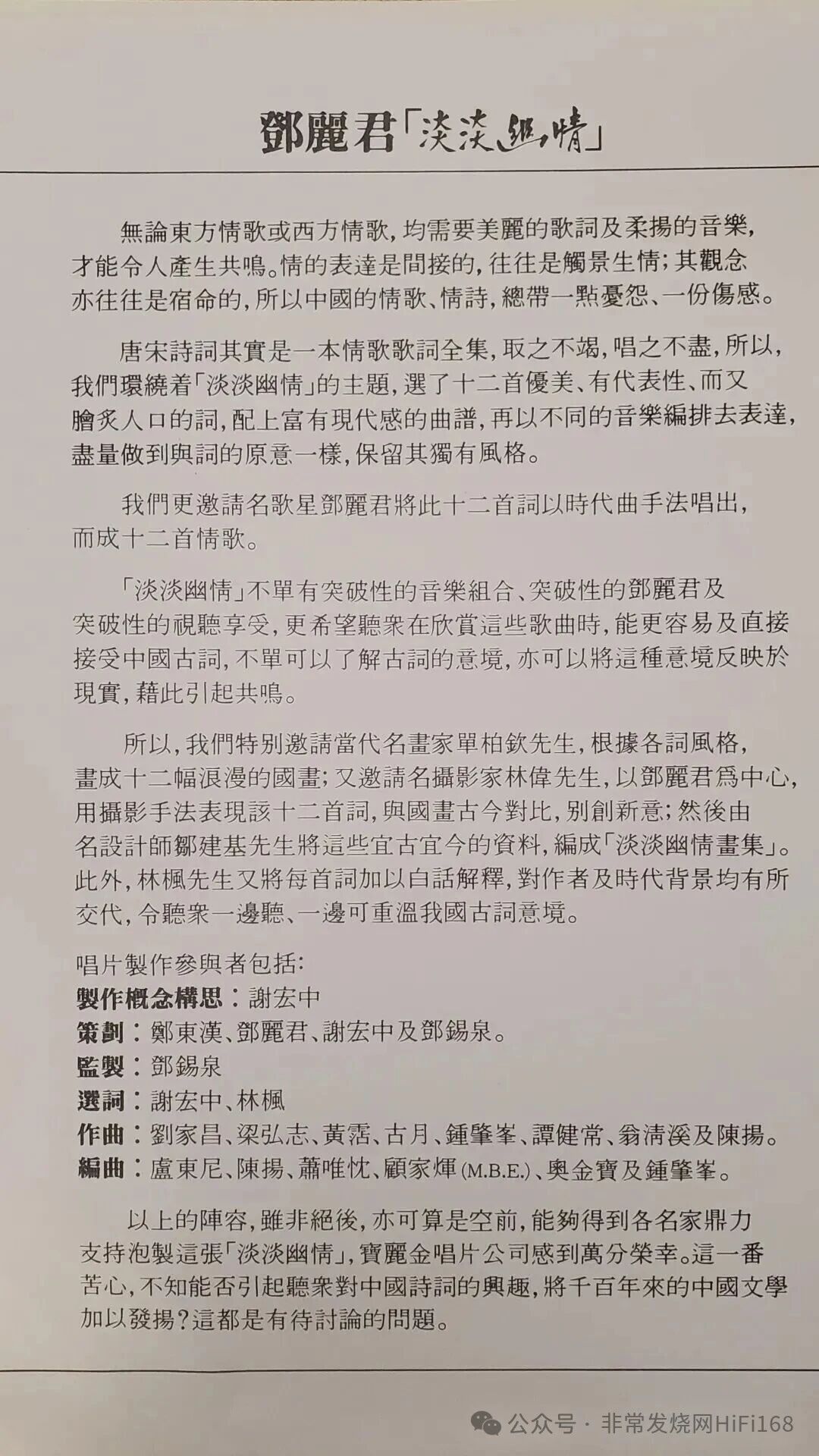 专辑收录的12首歌曲,皆源自李煜、苏轼、欧阳修等文学巨匠的传世词作。邓丽君以其与生俱来的温婉嗓音和深刻的情感领悟,将这些历经千年沉淀的文字赋予了全新的生命。无论是《独上西楼》中开篇那如真似幻的清唱,还是《但愿人长久》里那份跨越时空的深情祝愿,都展现了她作为一代歌后的绝代才情。这张专辑以其典雅、庄重又温柔多情的独特气质,在华语乐坛树立了一座前无古人、后无来者的艺术高峰。