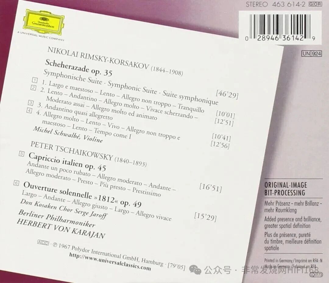 补白部分的《意大利随想曲》与《1812序曲》,卡拉扬也以灿烂而又丰富的处理做出完美诠释,专辑现以DG大禾花版推出,以独有的“原像比特处理技术”重新整理,相比于开始的LP版本,此版在保留了历史精彩演绎的同时,又在音响效果上更提升了一个档次,重点是售价也是相当实惠。