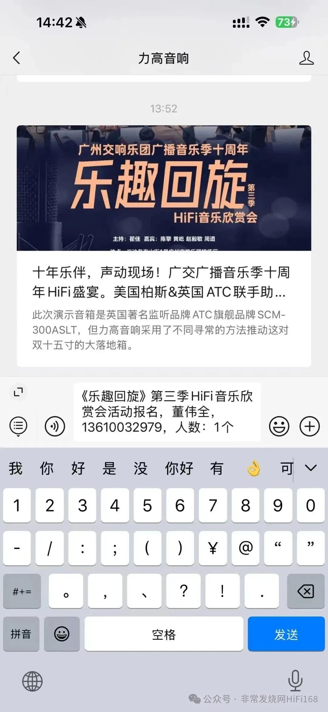 输入内容:《乐趣回旋》第三季HiFi音乐欣赏会活动报名,某某某,138XXXXXXXX,人数:X个。发送成功