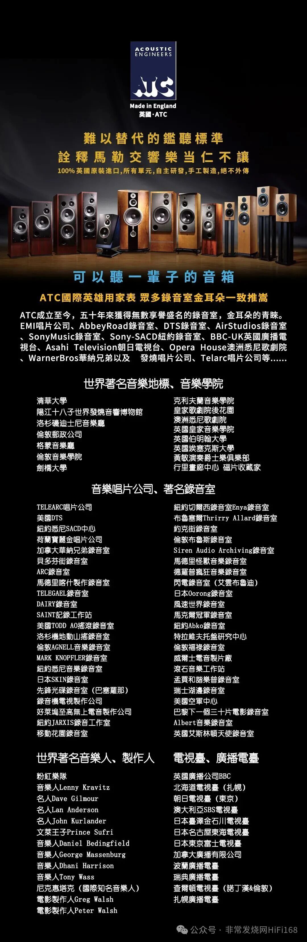英国ATC,是全球公认的顶级监听音箱,迪士尼音乐厅,悉尼歌剧院,众多世界顶级录音室、音乐厅、电视台都采用ATC音箱,原因只有一个,录音室,音乐家都认为ATC的声音最接近现场演奏的声音,最能还原演奏是音乐家想表达的情感。