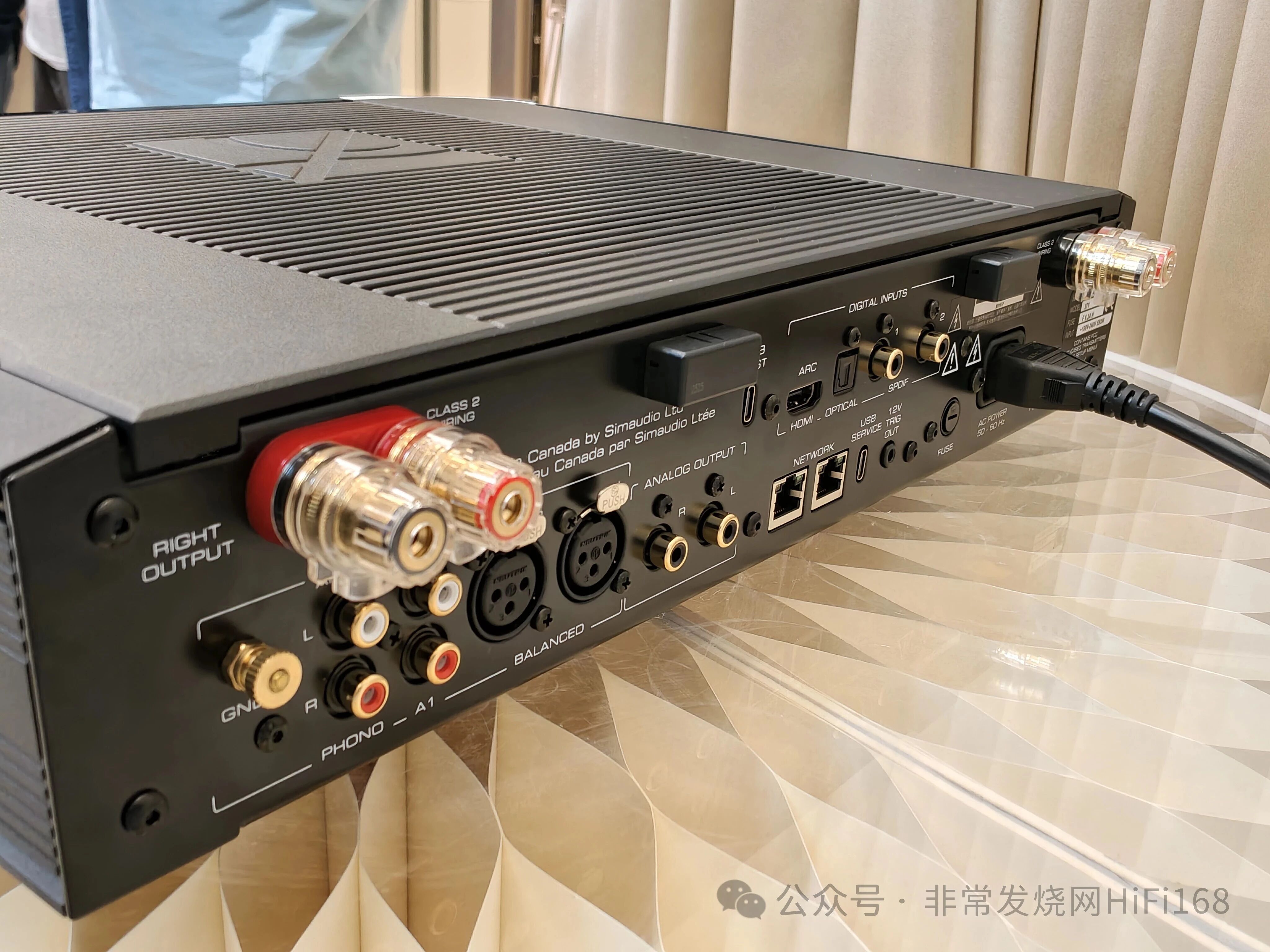 设备背部接口丰富,包含Wi-Fi天线(隐藏式设计更显优雅)、蓝牙AirPlay连接、模拟输入输出(RCA与平衡)、USB Host、HDMI ARC、光纤、同轴及网络接口,支持直连NAS和触发信号接入。模拟输出可设为固定或可变模式,便于连接外置功放或超低音音箱。