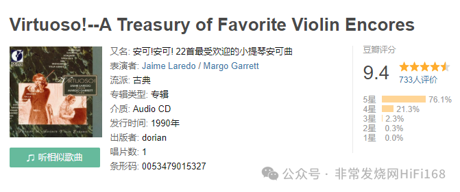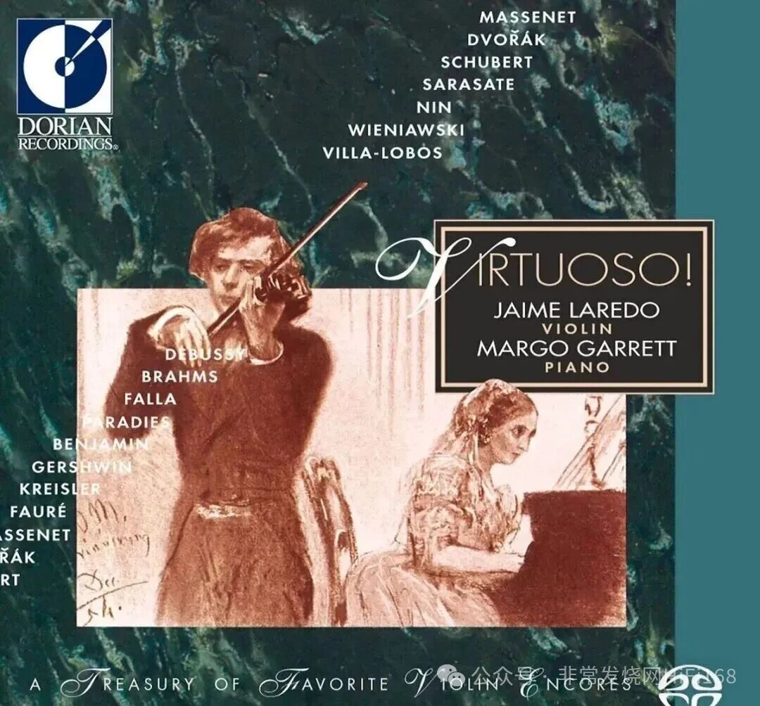 3.“像Jaime Laredo这样的演奏家音响迷不认识他实在太可惜了,同时也验证了获得最顶尖的音乐大赛首奖并不是飞黄腾达的代名词,有时候还是要看机运,Jaime Laredo的演奏细腻、温和、内敛、高贵,演奏起这张CD中的22首曲子并不是让人热血沸腾那种,也没有特别突出的炫技表现,但听起来就是很舒服。尤其录音效果非常棒,从第一首开始就能紧紧抓住音响迷的心。第十一首、十二首,德布西那两首棕发少女与月光,其温柔的程度就算你是钢铁也会融化。第八首 1 8From San Domingo」的擦弦质感也真实无比,而且可以听到弓弦的轻微弹跳,钢琴的触键质感也非常真实。”
