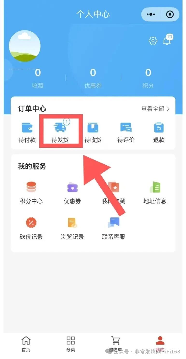 点击“待发货”→跳转到“我的订单”。
