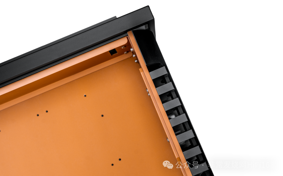 此外,功放侧面和顶部均设有散热元件,这些元件明显带有弗莱明的设计风格。音量按钮的外侧覆盖着钛金属,控制面板则设计成一块大型液晶触摸屏。