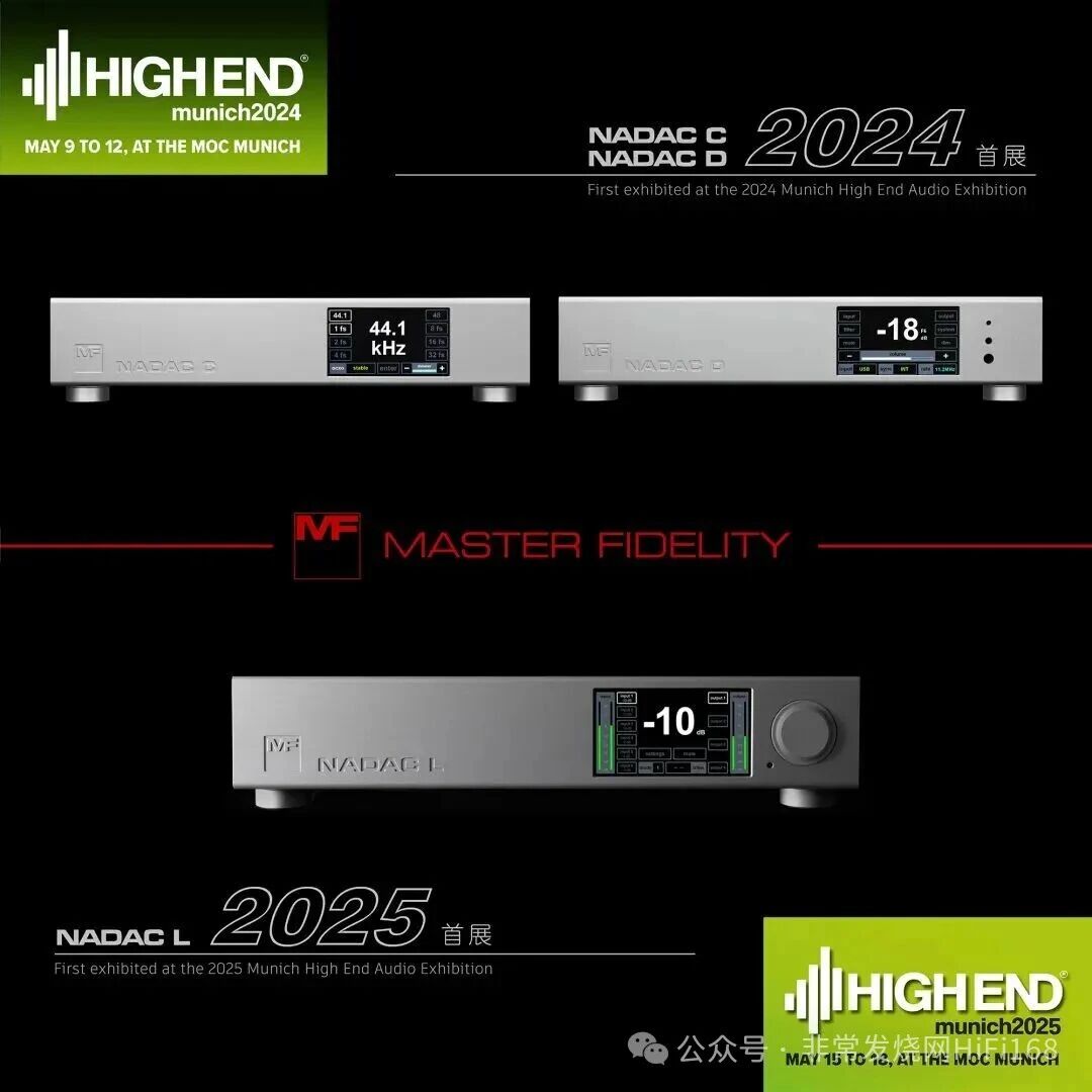 公司⼀经成⽴,便⽴即全⼒投⼊了新⼀代 NADAC 系列产品的研发。⽽公司全员抱定的决⼼和⽬标就是⻘出于蓝⽽胜于蓝!于是⾃ 2022 年⾄今 MF 就已推出了三件新⼀代 NADAC 系列产品:即 NADAC C 超低噪声⾳频时钟;NADAC D 真⼀⽐特数模转换器和 NADAC L 数控模拟前置放⼤器。其中 NADAC C 和 D 是于 2024年在慕尼⿊ Hi-End 展上⾸发,⽽ NADAC L 则是⾸次亮相于⼀年后的 2025 慕尼⿊ Hi-End 展。