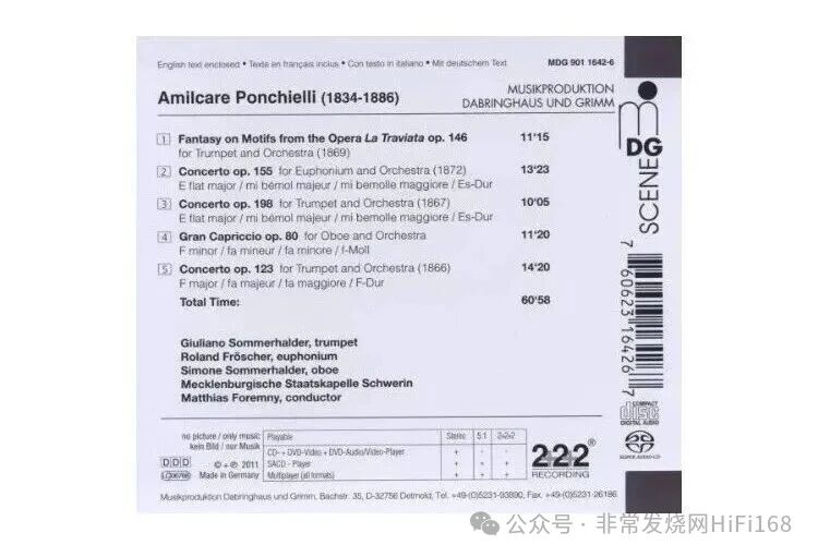 MDG使用独家2+2+2多声道录音技术,以SACD推出,一如既往地在三维空间中实现了良好的平衡,让声音艺术的表现更具丰富性,为您在家中即可带来真实的聆听乐趣。